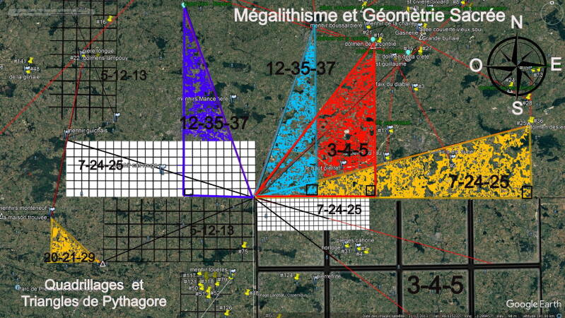 Si ces angles donnent des angles de diagonales de multiples carres ou de triangles de Pythagore on a là une découverte de la géométrie sacrée utilisée par les anciens pour placer leurs constructions mégalithiques en un vaste plan géométrique sur l’ensemble de la région qui, peut s’étendre sur des dizaines de kilomètres !