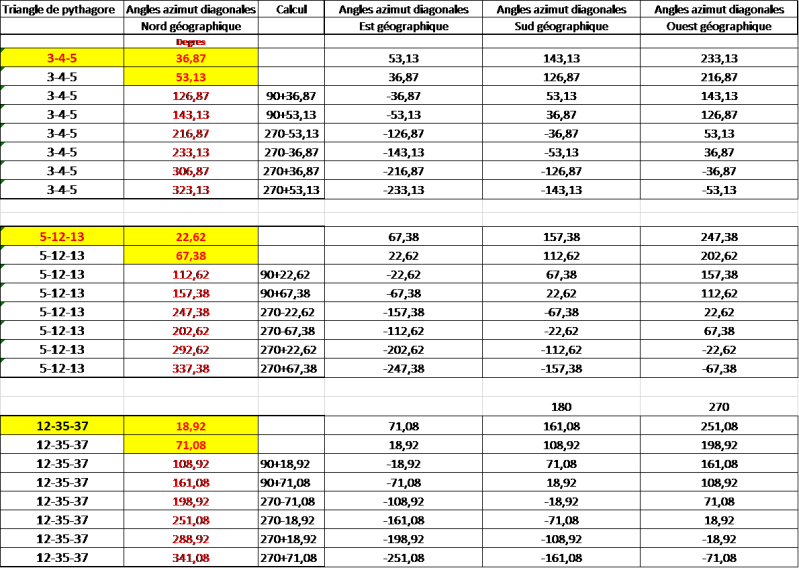 Je vous communique des tableaux avec ces angles particuliers qui vous permettront de chercher vous-même des alignements de géométrie sacrée sur google Earth.